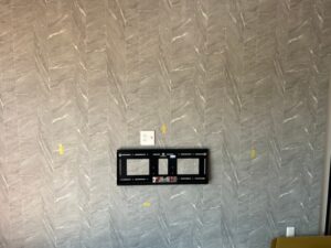 併せて、ふかし壁の内部に隠されていた配線類を引き出し、テレビを掛けた際に干渉しない位置へ整えます。こうした細かな配線処理こそ、専門の電気工事店に依頼する最大のメリットと言えます。DIYでは難しい「コードが1本も見えない仕上がり」を目指し、通線作業を丁寧に行いました。